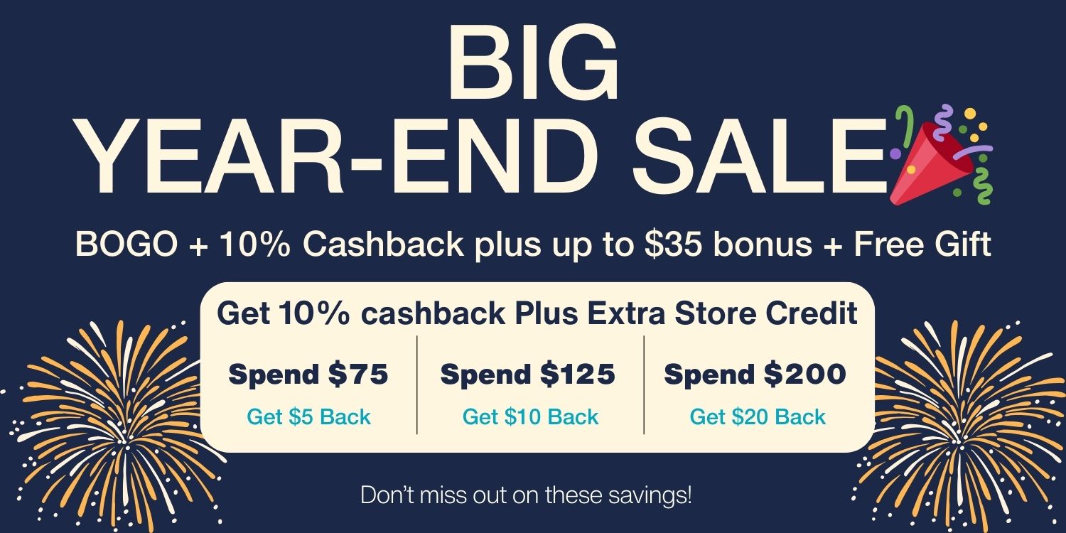 A: Every purchase earns 10% cashback on the total order value. During the Year‑End Sale, you also receive extra fixed cashback based on your spend: $5 when you spend $75, $10 when you spend $125, and $20 when you spend $200. These rewards stack together.